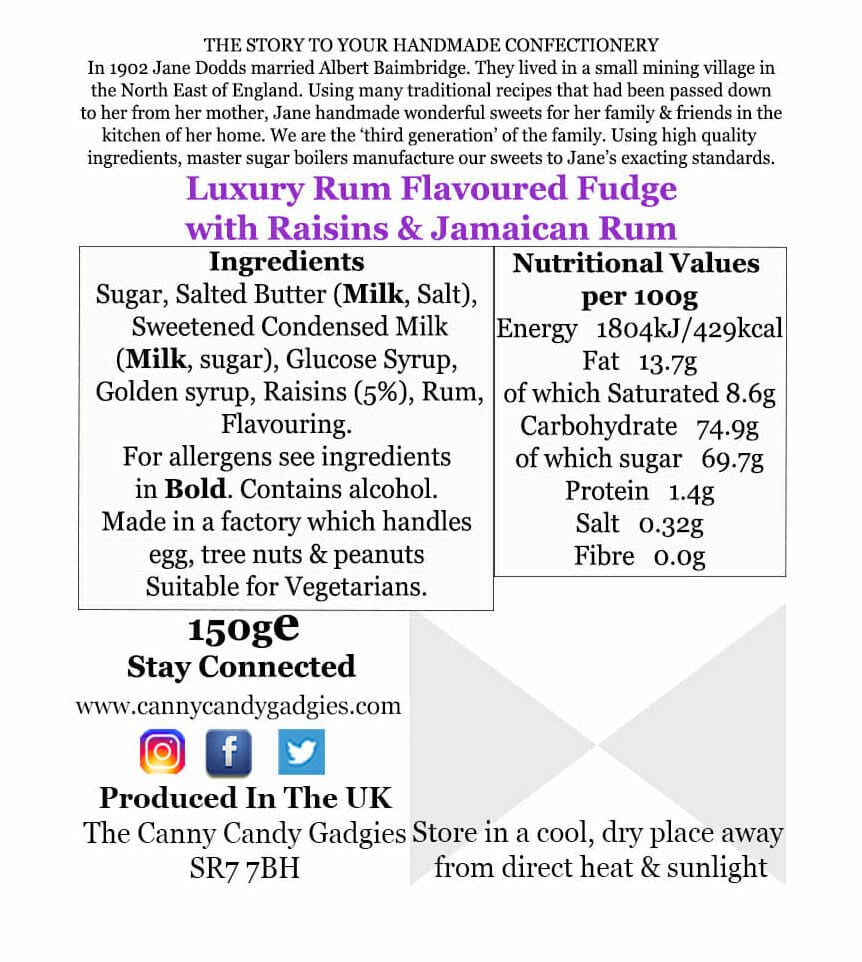 Handmade using traditional artisan techniques, our products are made in small batches, poured onto cooling tables & left to cool naturally. Once cooled it’s then hand scored, hand broken & hand packed. Your superior, sumptuous Jamaican Rum & Raisin Fudge contains only the finest ingredients, locally sourced wherever possible & always British Milk & Butter.