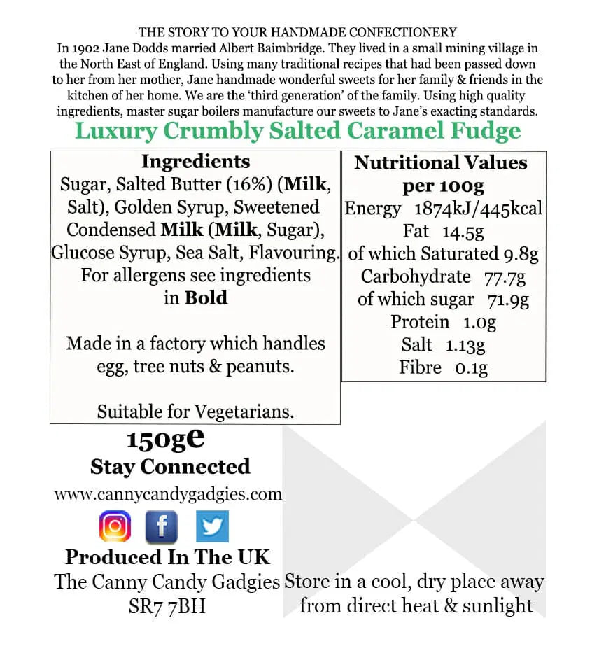 Handmade using traditional artisan techniques, our products are made in small batches, poured onto cooling tables & left to cool naturally. Once cooled it’s then hand scored, hand broken & hand packed. Your superior, sumptuous Crumbly Salted Caramel Fudge contains only the finest ingredients, locally sourced wherever possible & always British Milk & Butter.